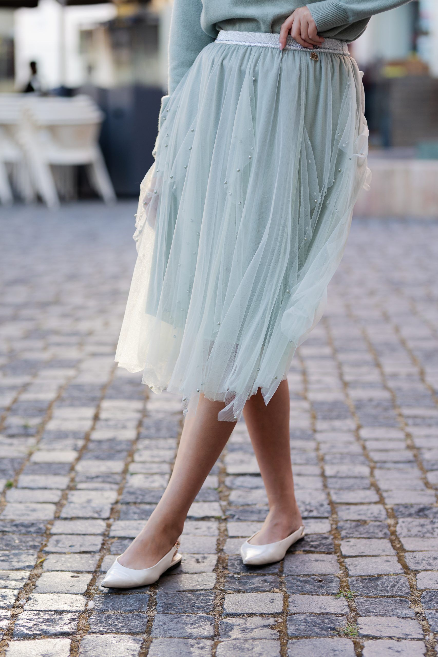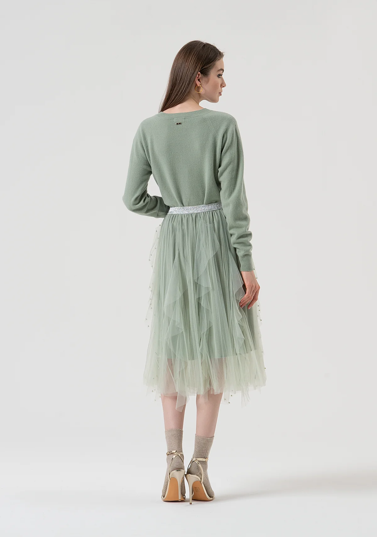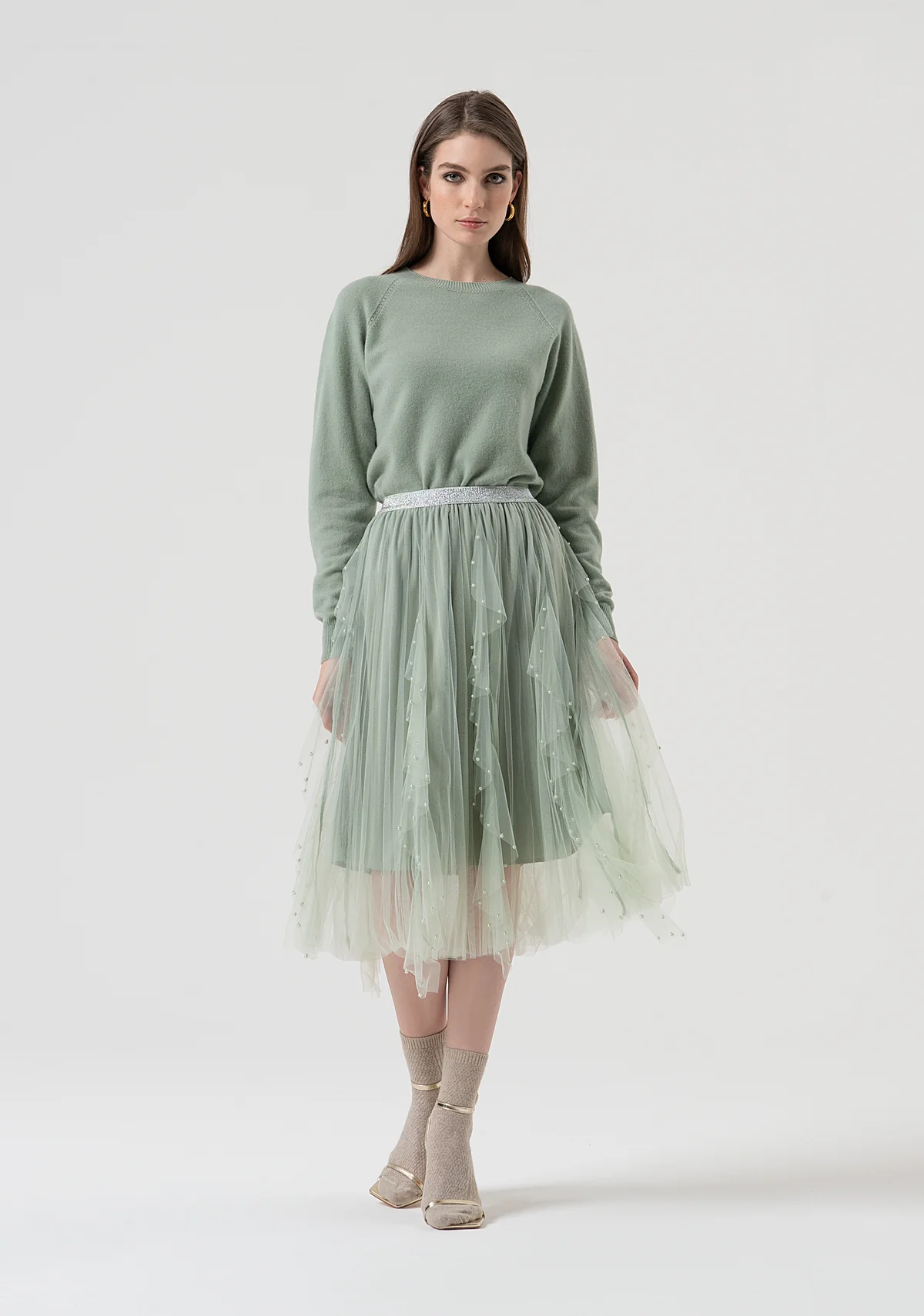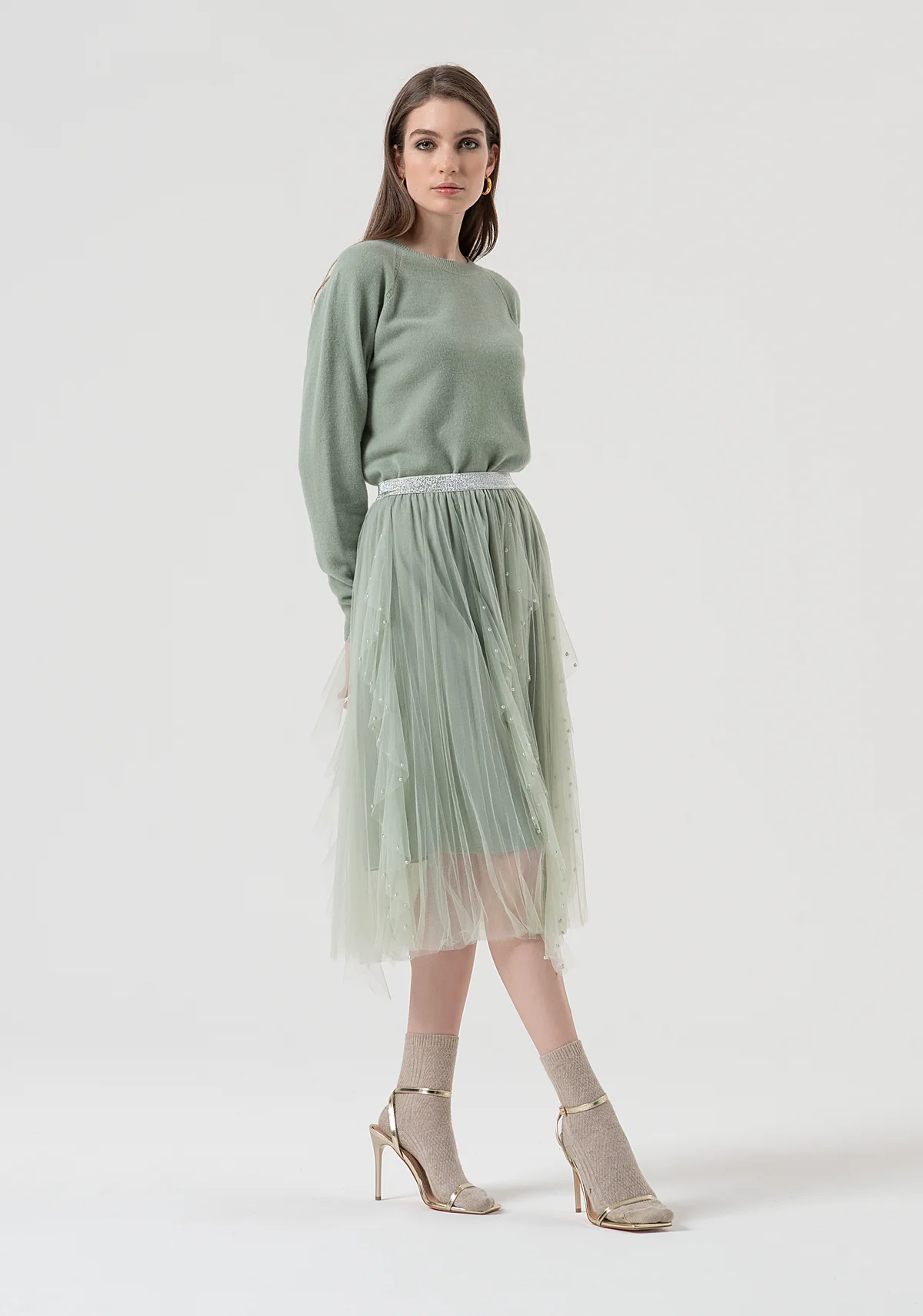 Saia rodada de comprimento médio em tule leve e delicado, com cintura alta em elástico lurex.